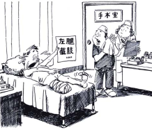 当病人手术后苏醒过来,发现有病的左腿依然如故,而没病的右腿却被截断时,气愤地举着诊断书质问医生。