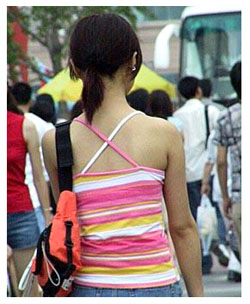 7月の北京は、とにかく暑い。35度以上の日が続いています。写真のように、背中をマルだし、(ノーブラ)最大限に涼しい格好の女性が良く見かけられます。これは何年か前には考えられないことでした。もっと自然、もっと大胆、もっとおしゃれにという北京女性の変化を覗き見ることができます。