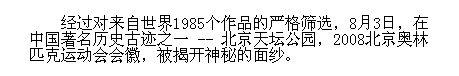 8月3日、世界から応募した1985作品の中から選ばれた2008年北京オリンピックエンブレム(シンボルマーク)の発表会が、北京市内にある中国を代表する歴史的遺産のひとつー天壇公園で行われました。
