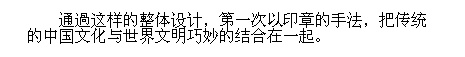 全体のデザイン通して、初めて中国の伝統文化と世界の文明を押された赤い印章によって結びつけることができました。