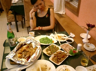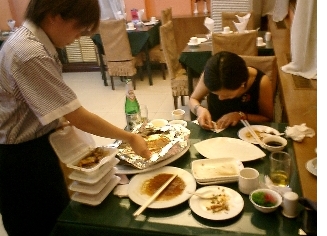 私たち二人は、一人は年頃の青年、もう一人は私ですが、女性だけど、今朝からほとんと何も口にしていないため、お腹ぺこぺこという最強チームです。ウェイトレスが去るとすぐ食事に没頭。「日本料理もいいけれども故郷の味に叶わない」「食べて!」と二人とも心の中で思いながら30分ほど食事に専念していました。しかし30分くらい食べ続けてから二人とも思わず箸を置き、ブレークタイムに入ることにしたのです。それからあとは「もうちょっと食べてよ」「結構食べたから、あなたが食べてちょうだい!」・・・ と二人で譲り合う始末。