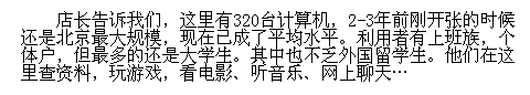 店長の話によると「全部で320台のコンピューターがあり、2−3年前オープンした当時は「北京ナンバーワンの規模」と誇っていましたが、いまは一般的になってしまいました。利用者はサラリーマン、OLもいますが大学生の数が一番多く、中に外国留学生もいます。彼らはここで資料を調べたり、ゲームを遊んだり、ネット映画、音楽を楽しんだり、チャートしたりして…」
